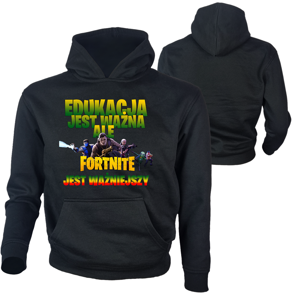 Bluza kangurka dziecięca z nadrukiem Edukacja jest ważniejsza ale Fortnite ważniejszy, bluza miła w dotyku, całość prezentuje się bardzo dobrze, fajny pomysł na prezent. Nadruk znajduje się na przodzie