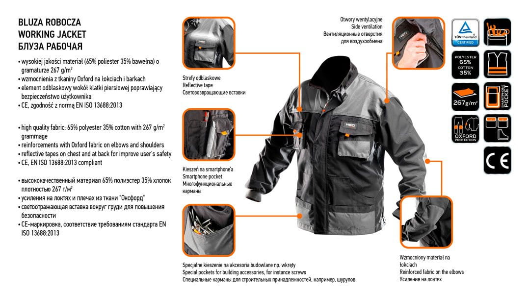 Bluza robocza NEO to niezwykle praktyczne rozwiązanie podczas wszystkich prac, zarówno profesjonalnych, jak i domowych. Wykonana z wysokiej jakości materiału wzmocnionego na łokciach. Podwójnie przeszyte szwy, zwiększające trwałość oraz elementy odblaskowe, zapewniające widoczność użytkownika. Solidne kieszenie wytrzymują duże obciążenie i przechowają wszystkie niezbędne podczas pracy narzędzia. Dodatkowym atutem jest właściwie ulokowana kieszeń na smartfona, dzięki której telefon można mieć zawsze przy sobie, nie martwiąc się o jego bezpieczeństwo. Gwarantem jakości jest certyfikat europejski oraz wykonanie zgodne z normą EN ISO 13688:2013. Marka NEO spełnia oczekiwania profesjonalistów.