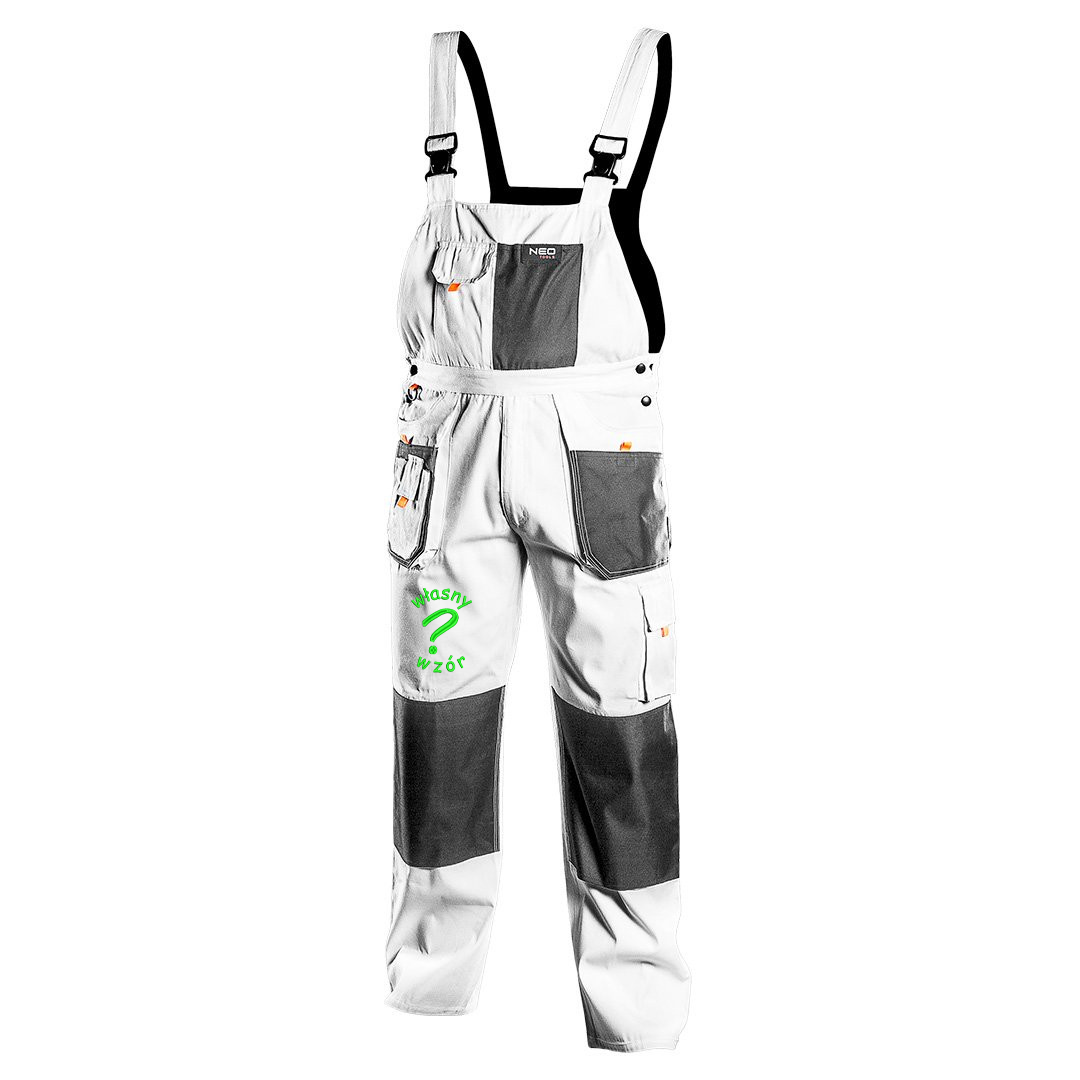 Spodnie robocze na szelkach ogrodniczki białe HD Neo Tools z haftem własnego wzoru