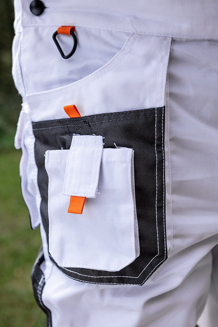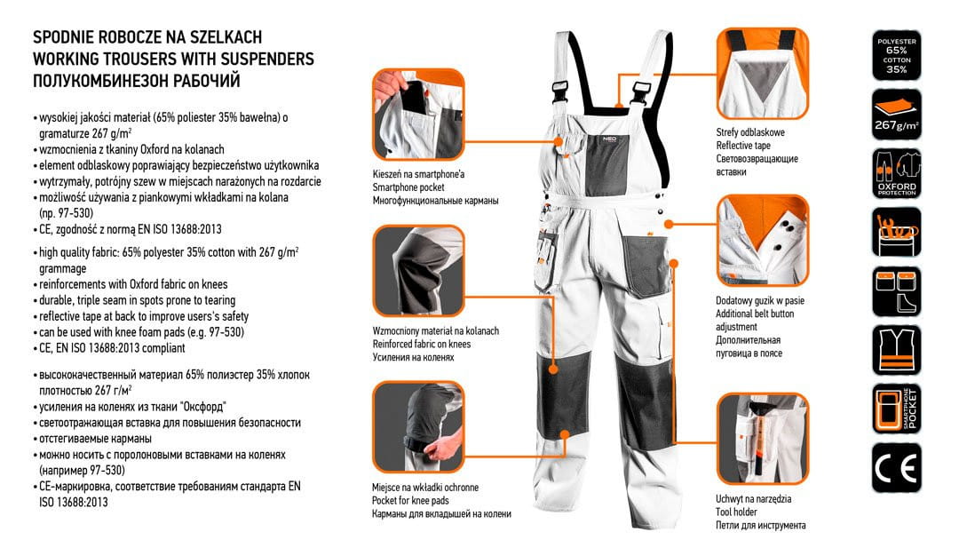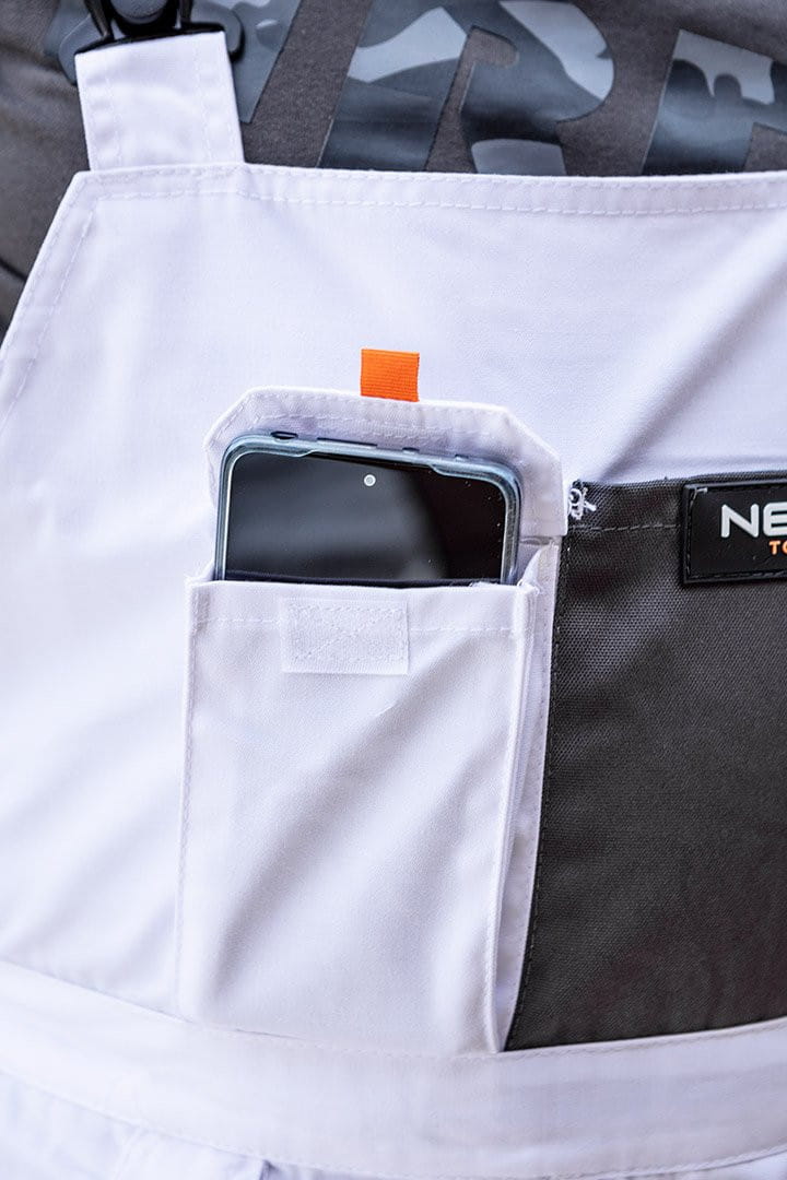 Białe spodnie robocze na szelkach NEO wykonane są z wysokiej jakości materiału, wzmocnionego w miejscach narażonych na przetarcie. Potrójnie przeszyte szwy, zwiększające trwałość łączenia oraz opcję włożenia nakolanników. Solidne kieszenie przechowają niezbędne narzędzia, a dzięki szelkom nawet duże obciążenie nie spowoduje dyskomfortu podczas pracy. Spodnie wyróżnia kieszeń na smartfona – powiększona względem dotychczasowych projektów, by zmieściła modele o większej przekątnej ekranu. Gwarantem jakości jest certyfikat europejski oraz wykonanie zgodne z normą EN ISO 13688:2013. Marka NEO spełnia oczekiwania profesjonalistów.